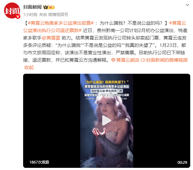 近日,贵州黔南一公司计划2月初办公益演出,特邀家乡歌手黄霄雲助力。结果黄霄云发现执行公司转头却卖起门票,黄霄云连发多条评论质疑:“为什么骗我”“不是说是公益的吗”“我真的失望了”。