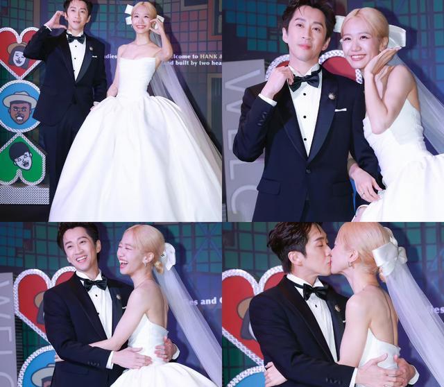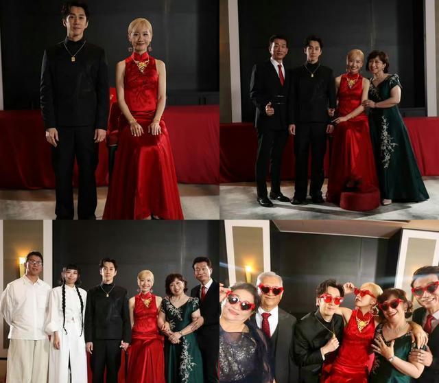 下午3点婚礼仪式准时开始,宴会厅里暖金色的灯光配上白色桔梗和尤加利叶,刚好戳中Lulu喜欢的“复古森系”调调。新人穿的是夏姿·陈定制的中式礼服,陈汉典一身藏青色长袍带暗纹刺绣,Lulu的正红色旗袍镶满了盘金绣牡丹,头上还戴了顶价值20万台币的法国古董头纱,裙摆拖在地上,流苏轻轻晃着特别显气质。两人互动特别亲昵,时不时低头说悄悄话,又或者相视一笑,邻桌宾客都忍不住调侃“这俩也太黏糊了,亲不停”,陈汉典听见了也不害羞,顺势就轻轻搂住Lulu的肩膀,眼里的宠溺藏都藏不住。